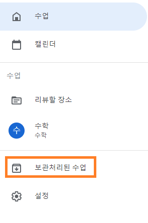 보관된 수업을 보려면 좌측 상단 3개의 줄을 클릭하여 가장 하단에 보관처리된 수업을 클릭하면 볼 수 있습니다.
