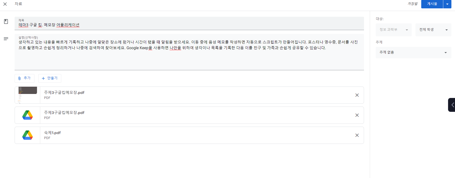 과제 제목과 내용을 적은 다음에 추가또는 만들기를 사용하여 과제를 만들면 됩니다. 추가 버튼을 통해 PDF 과제를 내주어 학생들에게 이것을 프리트하고 문제를 푼다음 스캔을 하여 제출하는 방식도 있지만 제가 추천하는 방식은 만들기 버튼을 사용하여 과제를 만드는 것입니다.