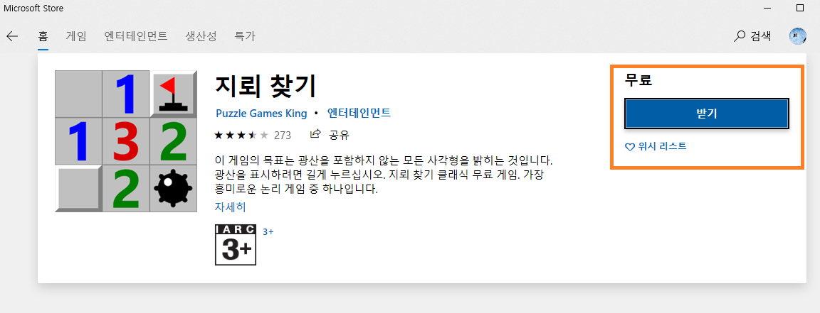 지뢰찾기 게임의 아이콘을 클릭하면 이제 다운로드를 받을 수 있는 창이 나오는데요. 여기서 받기 버튼을 눌러줍니다.