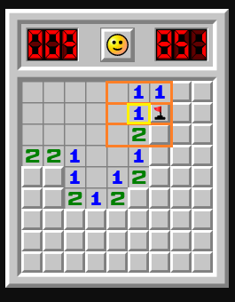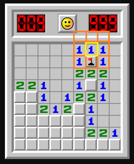 노랑색 1 위에 1 아래에는 2 그리고 왼쪽에 각 숫자 옆에있는 칸은 이미 폭탄이 없다고 나타난곳이기 때문에 우측 3개의 네모칸 중에 한곳이 폭탄이라는 말입니다. 유추와 추리를 하면서 진행하는 정말 머리를 생각보다 많이 쓰게 만드는 게임이 바로 지뢰찾기 입니다.
