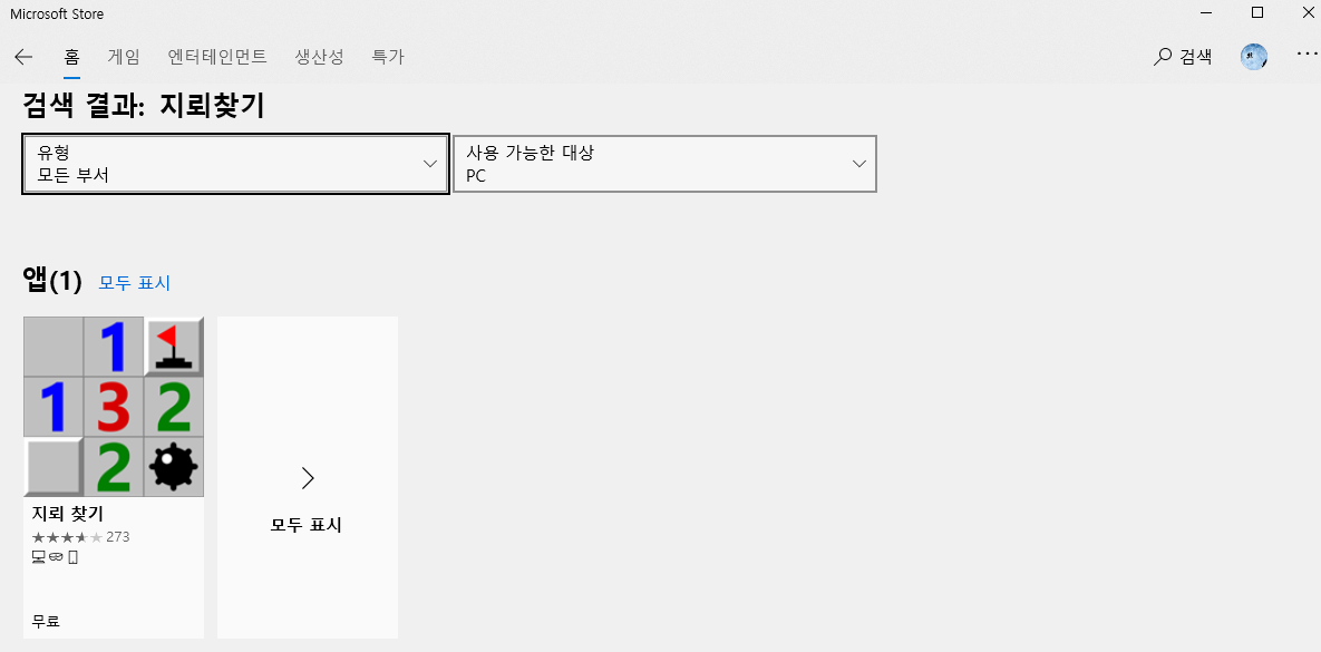 그러면 어플 창이 나타나는데 우측 상단의 검색 창을 통해 "지뢰찾기"를 입력 해 줍니다. 그러면 하단과 같은 화면이 나타나는데요.