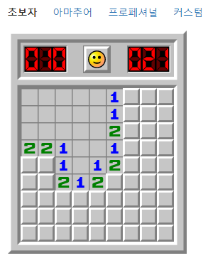 게임을 시작하면 네모칸중 아무곳이나 선택을 하면 지뢰가 없는곳이 한꺼번에 위에처럼 밝혀집니다. 여기서 우리는 숫자를 유심히 봐야하는데요.