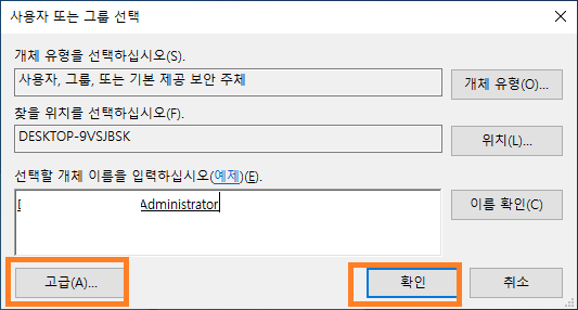 - 선택 할 개체 이름을 입력하세요. 원하는 유저를 지정해줍니다. 바로 아래 고급버튼을 사용해서 지정해주면 됩니다.
