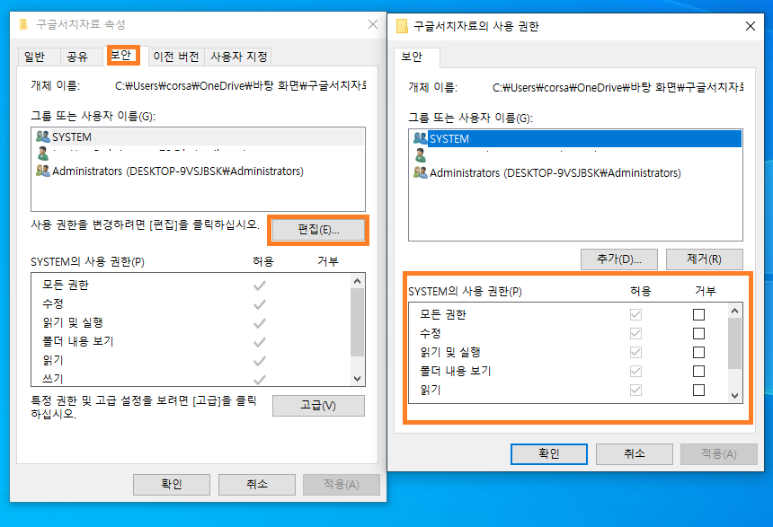 - 이제 허용 거부 란이 체크가 가능하게 표시가 됩니다. 원하는 권한을 부여하세요. 그리고 "확인"을 누르면 됩니다.