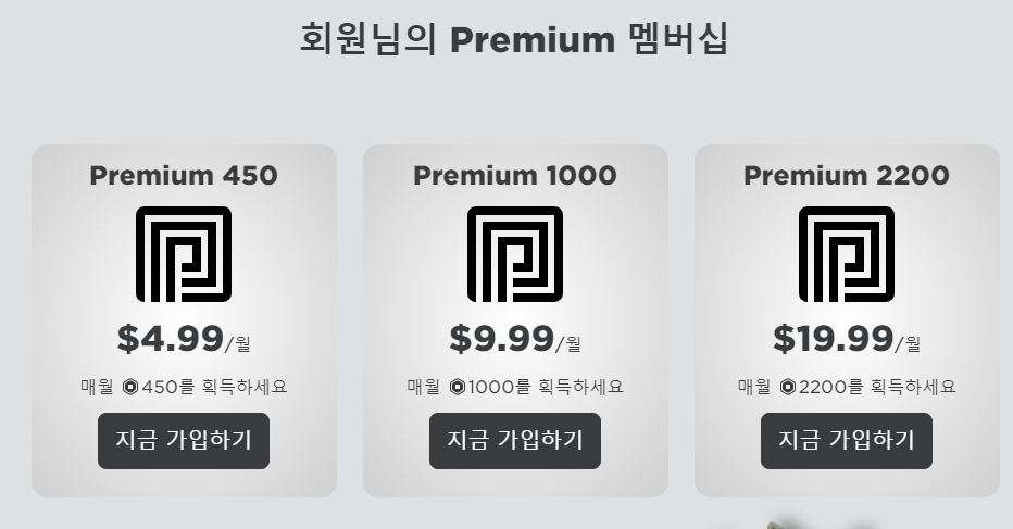로블록스 프리미엄은 총 3개의 과금으로 나누어지며 매달 결제가 될 때마다 지급되는 로벅스 양이 달라집니다.